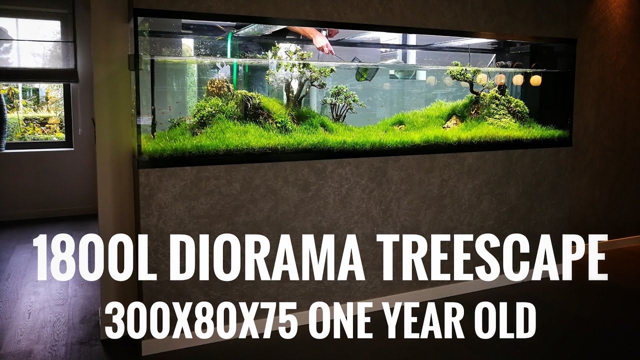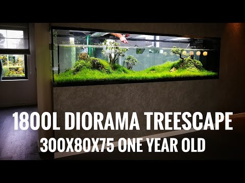 Diorama aquascape of 300x80x75h (1800L) with dead bonsai trees and dragon stones.